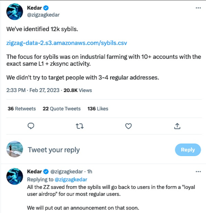 ZK Rollup 订单簿 DEX ZigZag 创始人 Kedar 在社交媒体上称,目前已经确认了 1.2 万个女巫地址,女巫的标准是拥有 10 个以上具有完全相同的 L1 + zksync 活动的帐户,仅用于 3-4 个常规地址的用户目前没有被标记。被标记的女巫地址不会发放空投,这部分代币将以“忠诚用户空投”的形式返回普通用户,并且将尽快发布公告。 此前报道,2 月 24 日,ZigZag 公布空投信息,总共 7 轮空投(已进行第一轮空投),共空投约 11 万个地址,空投总量为 3500 万 ZZ。