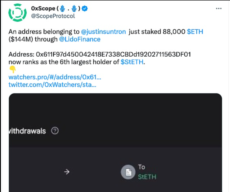 Web3知识图谱协议0xscope在社交媒体上表示,由Justin Sun控制的0x611F开头地址通过Lido质押了8.8万枚以太坊(价值约1.44亿美元),该地址目前已成为stETH的第六大持有者。 金色财经此前报道,2月26日,Justin Sun在Lido新增质押1万枚ETH,2月25日,Justin Sun钱包地址在Lido质押超15万枚ETH,价值约2.4亿美元。