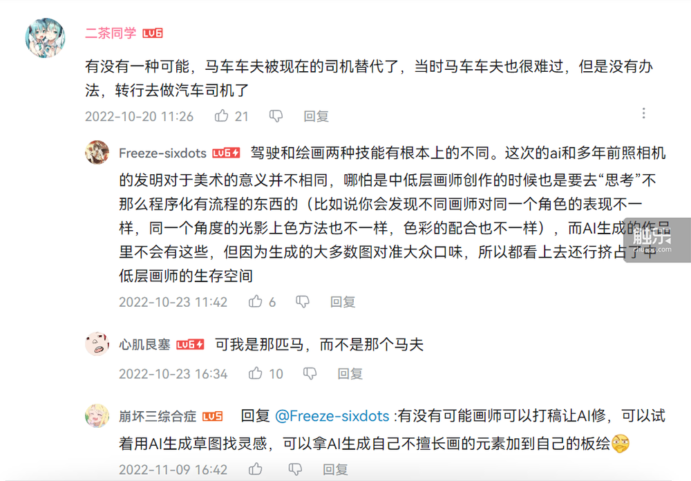 在阿豚的视频底下,有一条非常能代表大众态度的高赞评论:“你看别的手工艺人,有的人学了一辈子,好几代的手艺,一样被机器淘汰了,放平常心吧。”——这句话在未来的几个月间以各种形式不断被重复:手艺人和机器,马车夫和汽车,画师和AI绘画。大众以这样的比喻尝试去理解画师们的心情,但最终反而成了一场又一场新论战的导火索。
