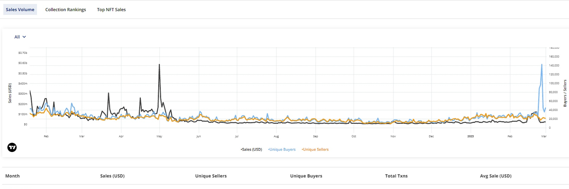 据Cryptoslam数据显示,2月以太坊链上NFT销售额达到约8.5亿美元,创下自2022年6月以来最高单月记录。此外,以太坊链上NFT交易量为2,866,371笔,创下截至目前最高单月交易量记录,其中独立买家630,638个,独立买家246,355个。