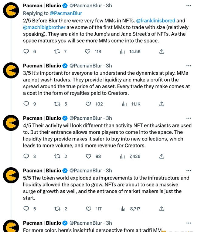 Blur创始人Pacman在社交媒体上表示,传统市场和代币市场的绝大部分交易量来自少数做市商(MM)。在NFT市场,来自MM的交易活动与来自收藏家的交易活动看起来非常不同。在Blur之前,NFT中的MM非常少,随着这个市场的成熟,你会看到更多的MM进入这个市场。 了解游戏中的动态对每个人都很重要,MM 提供流动性并从资产真实价格的价差中获利。他们进行的每笔交易都以支付给创作者的版税形式出现。他们的活动将看起来与NFT爱好者所习惯的活动不同。但他们的进入允许更多的玩家进入这个市场。他们提供的流动性使得购买新的收藏品更加安全,这导致了更多的数量,并为创造者带来更多收入。 随着基础设施和流动性的改善,代币世界爆发了,使市场得以增长。NFT也将看到一个巨大的增长,而MM的进入只是一个开始。