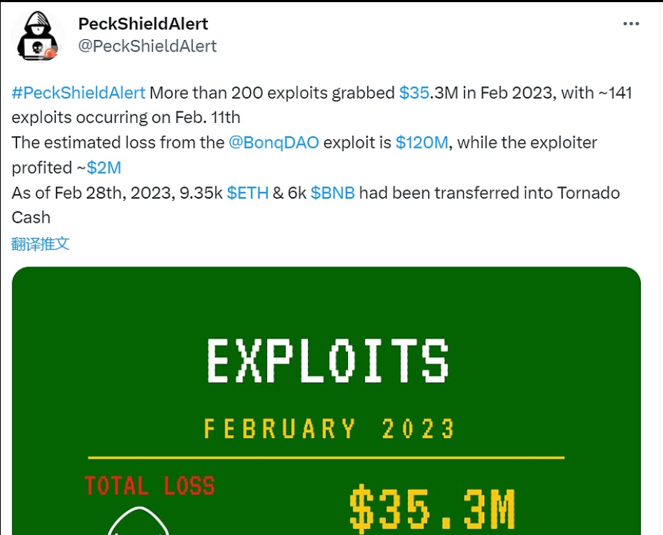 据PeckShield统计数据显示,2023年2月共监测到200多起漏洞利用事件,被盗金额达3530万美元,其中约141个漏洞利用发生在2月11日。其中最大的一起安全事件为BonqDAO的漏洞利用,造成的损失为1.2亿美元,而攻击者获利约200万美元。 截至2023年2月28日,93.5万枚ETH和6000枚BNB已转移到TornadoCash。