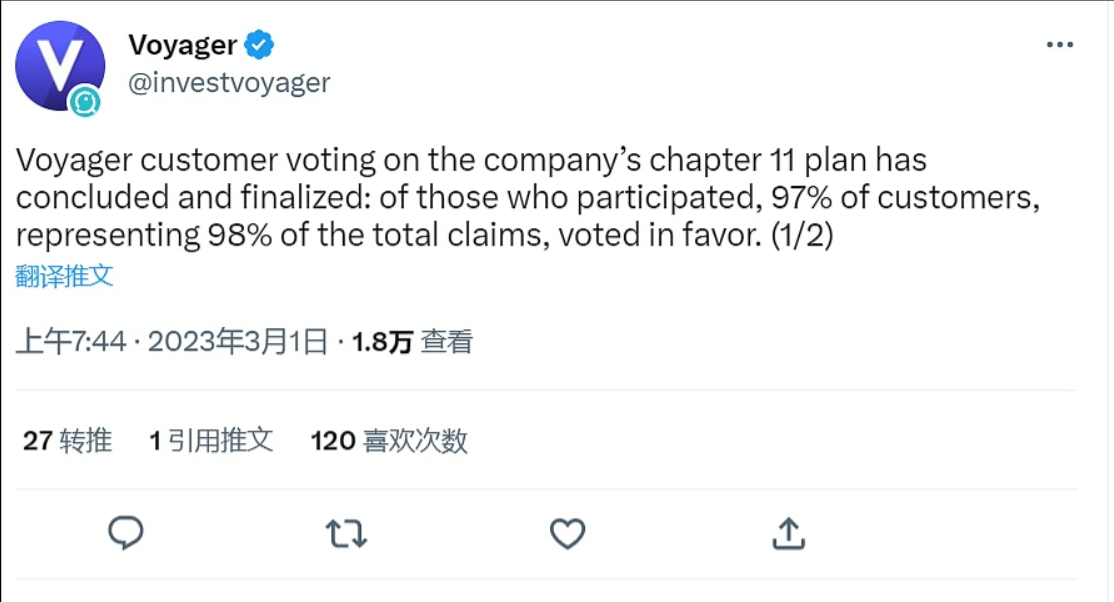 据官方推特,加密贷款机构Voyager表示,Voyager客户对公司破产重组的投票已经结束并最终确定,在参与的人中,97%的客户(占索赔总数的98%)投了赞成票。更多信息将在周四听证会后公布。 此前报道,美国联邦贸易委员会(FTC)反对Voyager Digital第三次破产重组计划,称这将非法地防止该公司因“实际欺诈、故意不当行为或重大过失”而被追究责任。破产法官Michael Wiles于1月13日有条件地批准Voyager的重组计划,并定于3月2日在曼哈顿举行听证会确认该计划。Voyager Digital于去年7月6日根据破产法第11章申请破产保护,该公司在8月、10月和12月分别提交了第一份、第二份和第三份重组计划。