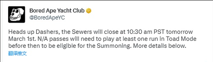 据“无聊猿”BAYC在社交媒体宣布,蟾蜍模式的“下水道”将于太平洋标准时间3月1日上午10:30(北京时间3月2日凌晨2:30)关闭,在游戏关闭之前,“N/A”持有者需要在蟾蜍模式下运行一次才有资格参与下一阶段的“Summoning”。下水道关闭后,蟾蜍模式的分数将锁定通行证,审核期将持续到2023年3月7日,之后蟾蜍模式的最终结果将更新并显示在下水道通行证上。