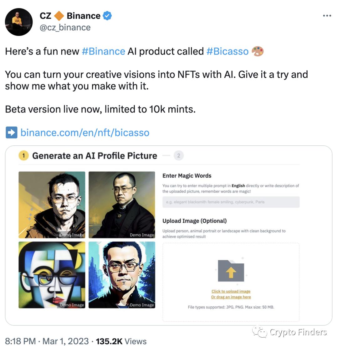 就在发文之前不久,CZ在推特中宣布,币安首个AI产品Bicasso正式上线。用户可以通过AI技术将个人作品,在添加相关描述后生成全新的NFT。这也是“以图换图”应用在区块链领域的首次上线。
