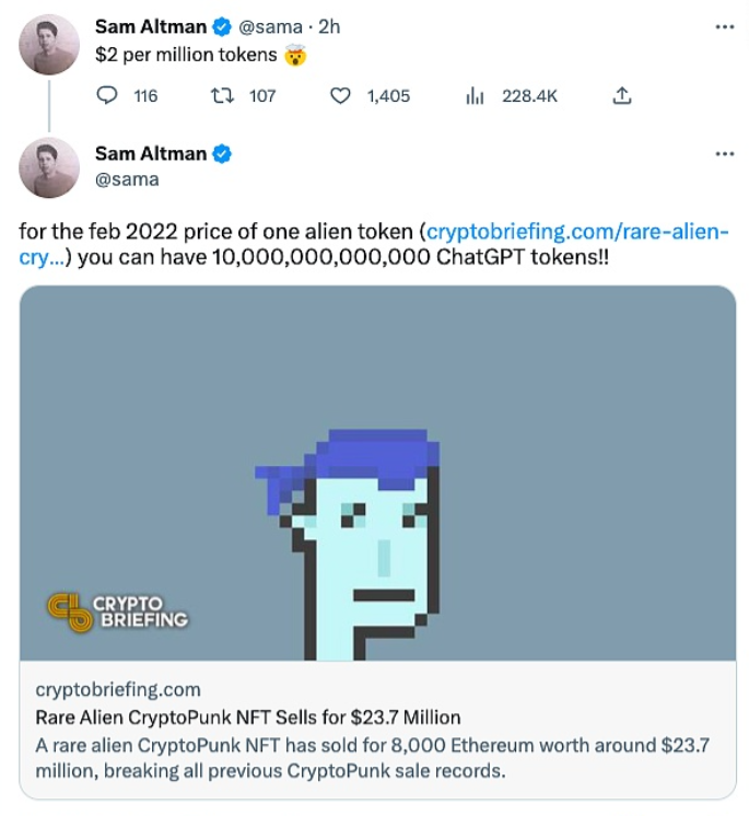 3月2日消息,OpenAI 首席执行官 Sam Altman 在社交媒体上发文表示,去年一枚 CryptoPunk #5822 NFT token 的价格为 2370 万美元,而使用 ChatGPT 时,仅需 2 美元就可以购得 100 万枚 token(ChatGPT 内字符单位)。 注:此处为谐音梗,二者 token 含义不同,Sam Altman 此说法旨在表达 ChatGPT API 收费合理。 据悉,OpenAI 于今日正式开放 ChatGPT API,本次开放的 API 背后模型定名为 gpt-3.5-turbo,实际功能与网页版 ChatGPT 相同,价格仅为此前 GPT-3.5 的 1/10,每输出 100 万个 token 的价格为 2.7 美元(约合 18 元人民币)。