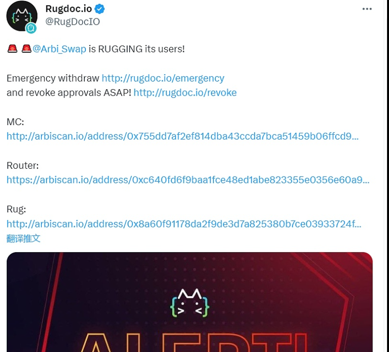 3月2日消息,据Rugdoc.io监测,Arbitrum生态DEX ArbiSwap疑似Rug Pull。相关 Token ARBI 价格短时下跌 100%。Rugdoc.io提醒用户尽快提取资产并撤销相关权限。