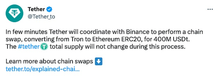 稳定币发行商Tether表示,几分钟后,Tether将与Binance协调进行换链,从Tron转换到Ethereum ERC20,换取4亿美金。在这个过程中,Tether的总供应量不会改变。