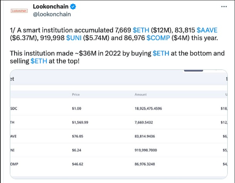 3月3日消息,Lookonchain发推称,一机构今年积累了7669枚ETH(1200万美元)、83815枚AAVE(637万美元)、919998枚UNI(574万美元)和86976枚COMP(400万美元)。该机构在2022年通过抄底ETH并在顶部卖出赚了3600万美元。 该机构在2022年6月24日至8月1日期间从币安收到了95138枚ETH(当时价值1.18亿美元),平均接收价格为1237美元;并于2022年8月15日、9月14日和9月15日向币安转账95100枚ETH(当时价值1.54亿美元)。 此外,该机构在1月4日和今天从币安收到了86976枚COMP,平均接收价格为39美元;1月4日和1月7日从币安收到83815枚AAVE,平均接收价格为57美元;今天从币安收到了919999枚UNI,平均接收价格为6.2美元;1月4日和2月22日从币安收到了7669枚ETH,平均接收价格为1492美元。 Lookonchain称,这家机构与IOSG Ventures有关联,因为他们使用相同的币安存款地址。