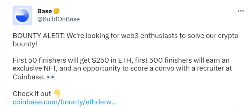 Coinbase以太坊L2网络Base在社交媒体宣布正在寻找Web3人才以提供加密赏金解决方案,前50名解决其赏金问题的人可以获得价值250美元的ETH,前500名可以获得独家NFT,并有机会与Coinbase招聘人员进行交流。