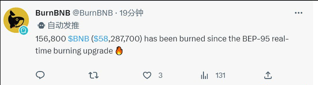 Burn BNB发布推特表示,BNB实时销毁量15.68万枚,价值约5829万美元。据悉,BNB的实时销毁机制由BEP95提出,类似以太坊当前的EIP-1559销毁机制。