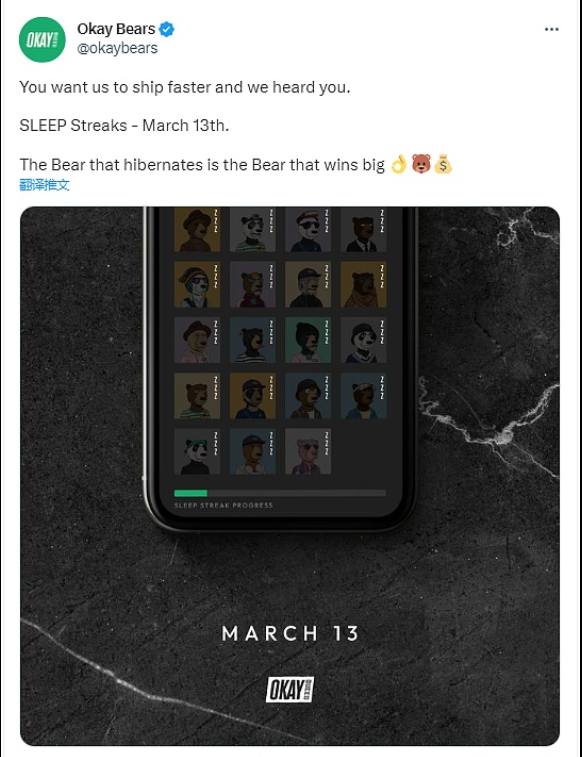 据Okay Bear在社交媒体披露该NFT项目将于3月13日推出“Sleep Streaks”Sleep Streaks 是Okay Bears给予的三种连续奖励之一