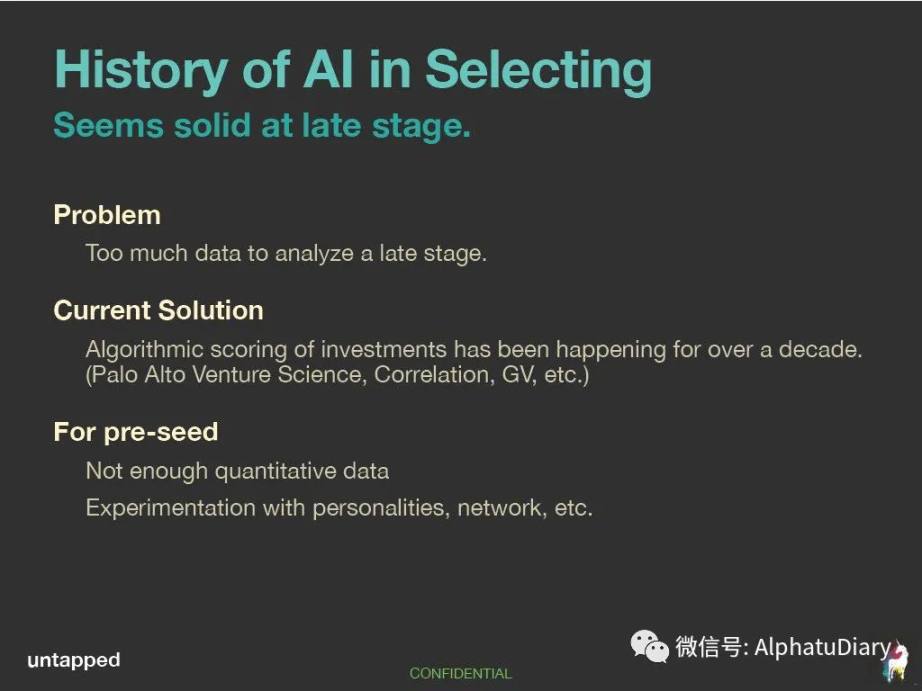 人工智能在项目选择方面的历史:通过算法打分已经有了一定的实践,不过,在有大量数据的中后期投资阶段是有效的,不过这种打分仅仅是超越平均水平而已。在种子期投资阶段,没有足够的数据。