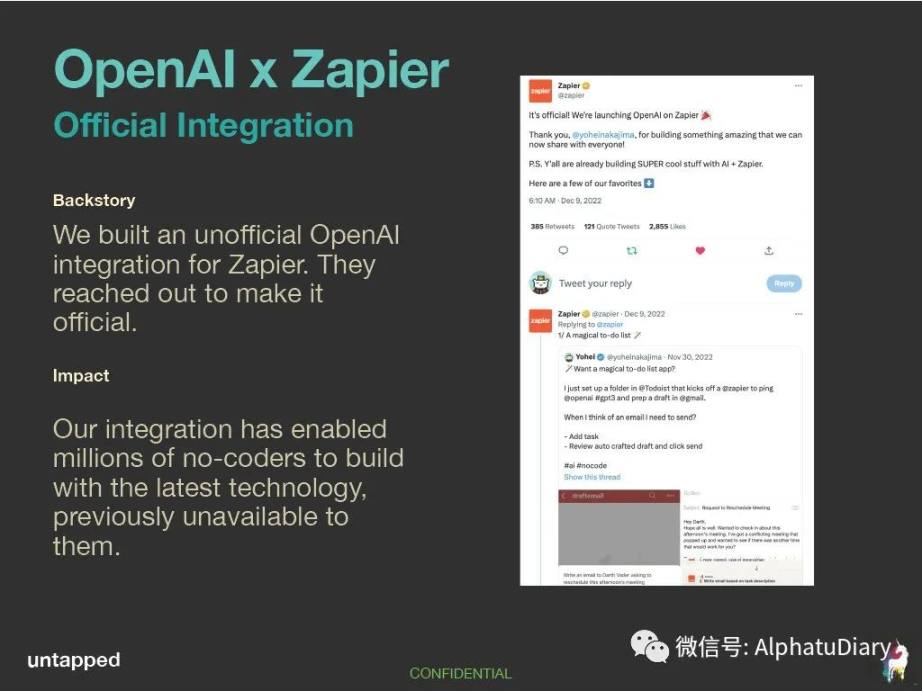 整合了 OpenAI x Zapier,帮助数百万的非编程人员利用 GPT-3 进行建设: