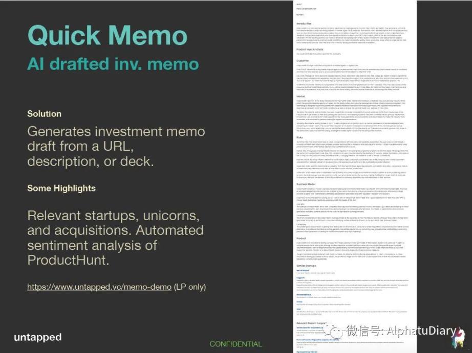 Quick 投资备忘录可以生成大量的洞察力以及类似的创业公司、独角兽公司和收购内容。还有来自 ProductHunt 的分析,以及许多其他有待添加的功能。
