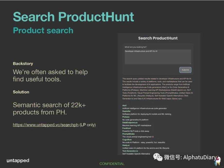 产品嵌入了最近的 22000 个 ProductHunt 描述,大家可以很容易地找到我们正在寻找的任何产品的评价