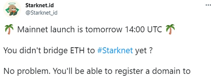 12月7日消息,StarkNet身份与域名服务Starknet.id在推特上表示,将于北京时间今日22:00上线主网。用户无需将以太坊跨链至StarkNet,而是可以直接通过MetaMask使用以太坊主网上以太坊支付费用。