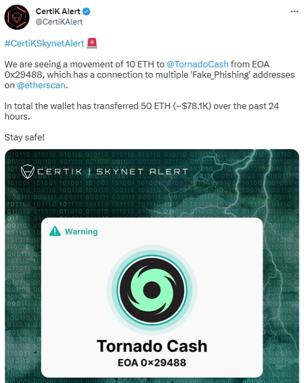 据CertiK监测,EOA账户地址 (0x29488)向Tornado Cash转入10枚ETH。该EOA地址与多个Etherscan上的网络钓鱼地址有关。在过去24小时内,该钱包总共转移了50枚ETH(约7.81万美金)。
