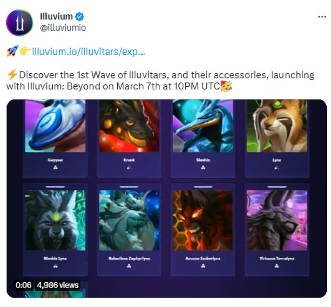 3月6日消息,RPG链游Illuvium在推特上表示,首轮Illuvitar及其配件,将于北京时间3月8日06:00(UTC时间2023年3月7日22:00)与新收藏游戏Illuvium: Beyond一起发布。 根据此前消息,Illuvitar是一个可定制的NFT集合,其中包含拥有各种配件、背景和表情的Illuvial插图。Illuvitars将以两种类型的打包出售,即Illuvitar D1SK和Mega D1SK。Illuvitar D1SK包括1件奖励等级Illuvitar、1件随机Illuvitar、3个配件,Mega D1SK包括1件稀有物、1件随机Illuvitar、3个配件。用户可以在销售窗口期间铸造无限数量的Illuvitar。一旦销售结束,这些Illuvitar将永远不会再铸造。
