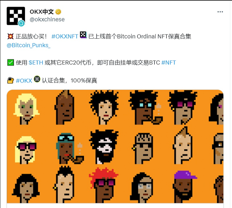 据欧易官方消息,欧易NFT市场已上线首个Bitcoin Ordinal NFT合集 —— Bitcoin Punks,该合集为通过托管工具 EmblemVault进行封装后的保管凭证 NFT。买方购买保管凭证后,卖方即失去对原Bitcoin NFT的控制权,买方可以继续挂单售卖,也可以前往 EmblemVault 提取NFT到自己的BTC钱包。 欧易NFT市场的Bitcoin Punks合集均为通过欧易OKX安全验证的真实NFT,用户可通过该合集使用ETH或其它ERC20代币自由交易BTC NFT,安全便捷,避免购买到虚假NFT或私下交易造成资产损失。