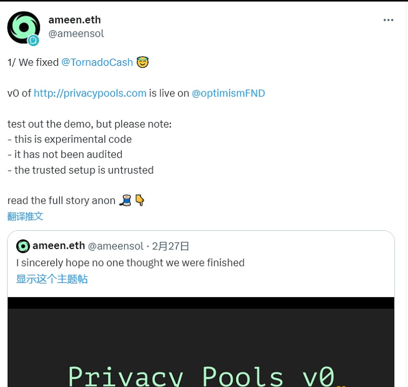 据Tornado Cash早期贡献者Ameen Soleimani发推称,Tornado Cash分叉混币应用Primacy Poolsv0现已上线Optimism,并表示这是实验代码,尚未经过审计,受信任设置上不受信任的。MolochDAO正计划为此后的开发提供后续资助。 此前报道,Ameen Soleimani与另一位开发者创建Primacy Pools,允许用户匿名发送与接收以太坊,并新增功能允许用户公开证明自己不是朝鲜人或其他类型罪犯。