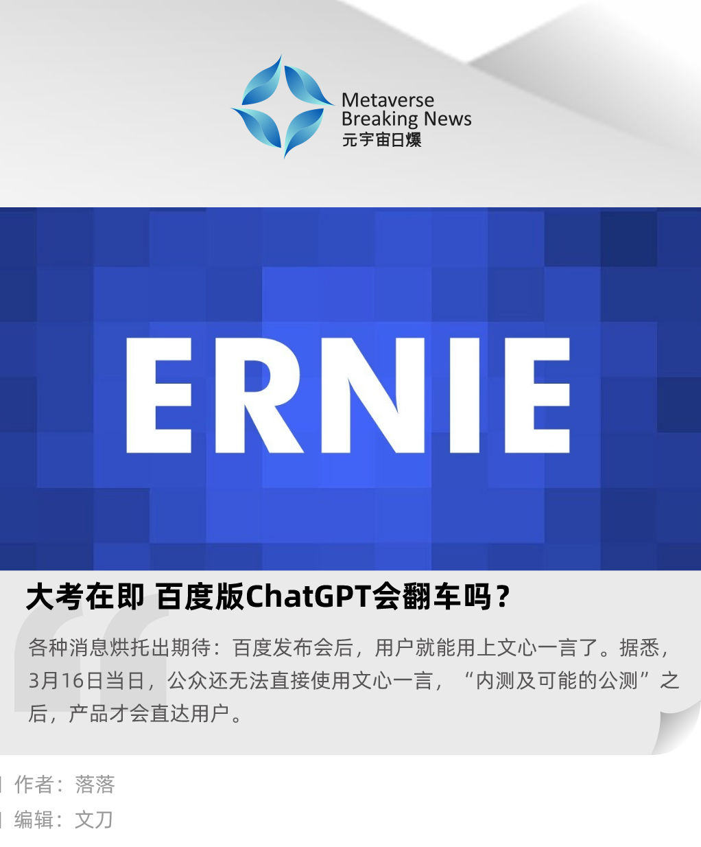 这个结果恐怕要等到文心一言产品正式向公众开放后才能评估,而《元宇宙日爆》从内部获悉,3月16日当日,公众还无法直接使用文心一言,“内测及可能的公测”之后产品才会直达用户。毕竟,谷歌、微软的同类产品翻车在前,百度有前车之鉴,以多测确保重点产品的稳妥。