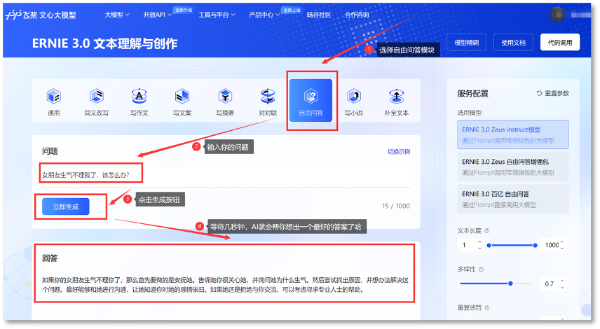 有程序员在百度的飞桨社区中放出过ERNIE3.0在“文本理解与创作”上的效果,截图显示,该模型可实现同义改写、写作文、对对联、写小说、补全文本等功能,其中也支持自由问答,输入问题后,点击立即生成,就会获得AI的答案。