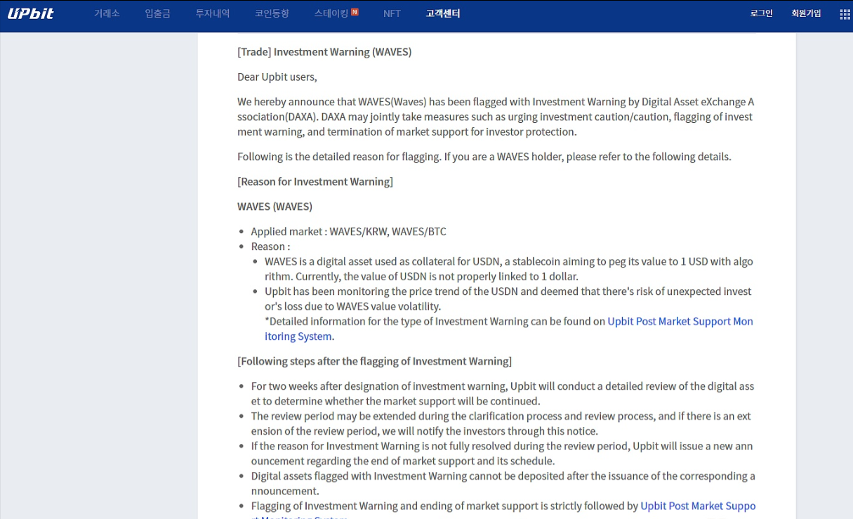 12月8日消息,韩国加密货币交易平台Upbit发布公告,由于Waves生态算稳Neutrino USD(USDN)已脱锚,其抵押品 WAVES(Waves)已经被数字资产交易平台协会(DAXA)标记为“投资警告”(Investment Warning),即风险币种。 截至发稿时,行情显示,Waves现报2.148 USDT,24H跌幅为7.48%。