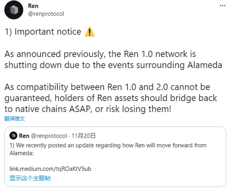 12月8日消息,资产跨链协议Ren Protocol发文表示,按照此前通知,Ren1.0正在关闭,因无法保证Ren1.0与Ren2.0之间的兼容性,Ren资产(如renBTC、wBTC等)持有者应尽快将资产桥接回原生链,否则将面临资产丢失风险。同时,Ren Protocol发布资产查询以及资产桥接链接,并表示将以Ren2.0形式回归。 此前消息,Ren Protocol因Alameda事件破产,表示需要新资金支持。随后,Ren宣布将推出最新版本的协议Ren2.0。