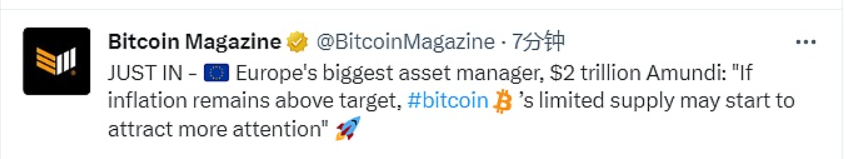 欧洲最大的资产管理公司、市值2万亿美元的Amundi表示:“如果通货膨胀率仍然高于目标,有限供应量的比特币可能会引起更多关注。”