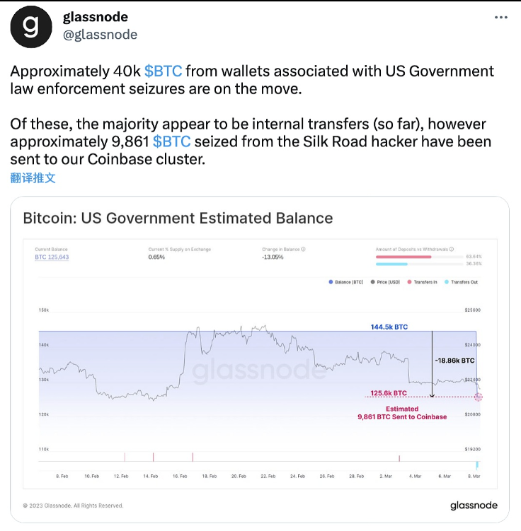 加密数据分析公司Glassnode表示,美国执法部门相关地址中约4万枚比特币正在进行转移,其中9861枚比特币被发送至Coinbase,其余部分转移目前为止或为内部转账。 今日早些时候报道,派盾监测数据显示,美国执法部门相关地址将4.9万枚BTC(价值约合10亿美元)转至Coinbase(超过9,800枚BTC)、bc1qf2开头地址(超过3万枚BTC)和bc1qe7开头地址(约9,000枚BTC)。这部分BTC是美国执法部门于2021年11月和2022年3月扣押涉及暗网丝绸之路(Silk Road)的非法所得。