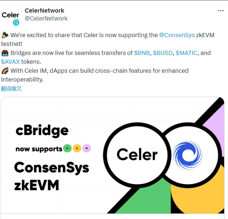 Celer Network发推称,cBridge和Celer链间消息传递技术 ( Celer IM ) 现已支持ConsenSys zkEVM测试网,BNB、BUSD、MATIC和AVAX代币的无缝跨链桥已上线。