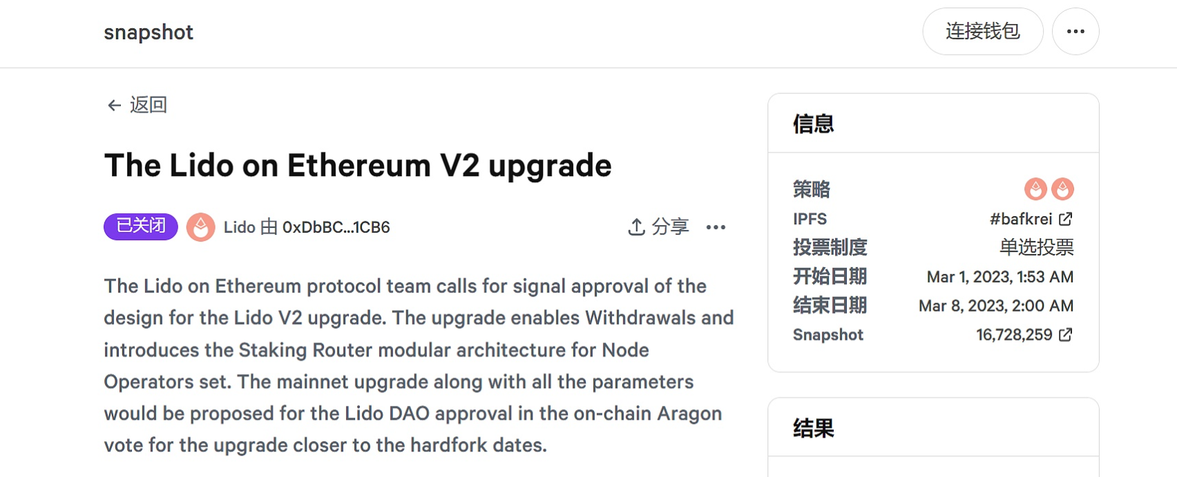 3月8日消息,Snapshot页面显示,Lido关于在以太坊上V2版本升级的提案以100%的支持率获得投票通过。根据该提案,V2版本升级将包括对以太坊提款的支持以及质押路由器。Lido计划在提案通过后于3月7日至31日期间在Goerli测试网上进行测试。V2版本在主网上的部署则取决于以太坊Shapella升级时间以及审计结束时间。