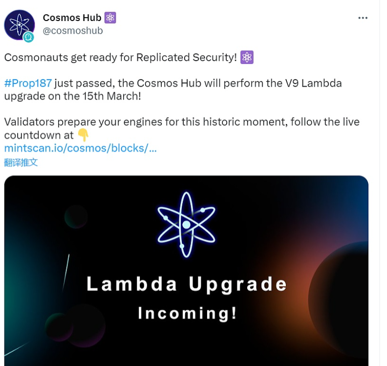 3月8日消息,Cosmos Hub发推称,v9 Lambda升级提案已经投票通过,支持率达99.48%。V9 Lambda升级将于3月15日进行。 根据该提案,本次升级旨在激活Replicated Security功能,这将强制执行链间安全性(ICS)的良好运行规则。Replicated Security功能可将Cosmos Hub的安全性复制到消费者链,并监控对规则的遵守情况,消费者链可以从Cosmos Hub的安全性中受益,而不必维护自己的验证者。