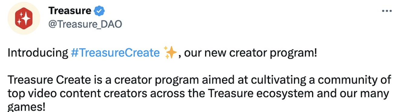 3月8日消息,去中心化游戏生态系统 TreasureDAO 宣布推出新的创作者计划 Treasure Create,旨在培养 Treasure 生态系统和游戏中的优秀视频内容创作者社区。 作为官方的 Treasure Creator,内容创造者可以利用 Treasure 的 15 万以上玩家和游戏的大型社区来增加曝光率,并获得诸如 Allow List、游戏内道具、游戏测试的早期访问以及与其他创造者合作的机会。目前该计划已与 10 位早期创造者合作,并正募集更多的内容创造者加入 Treasure Create。