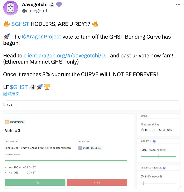 3月8日消息,Aave 生态 NFT 项目 Aavegotchi 发起的关闭协议 Token GHST 联合曲线的提案投票现已开启,一旦投票人数达到法定的 8%,联合曲线将关闭。 此前报道,2 月 28 日,Aave 生态 NFT 项目 Aavegotchi 发起的关闭协议 Token GHST 联合曲线的提案已获投票通过。提案认为 AavegotchiDAO 经过两年的发展已经具备足够的成熟度和流动性来满足项目发展,因此提议关闭 GHST 联合曲线,将 GHST 与 DAI 脱钩,固定其供应,并使 GHST 成为自由流通的 Token。