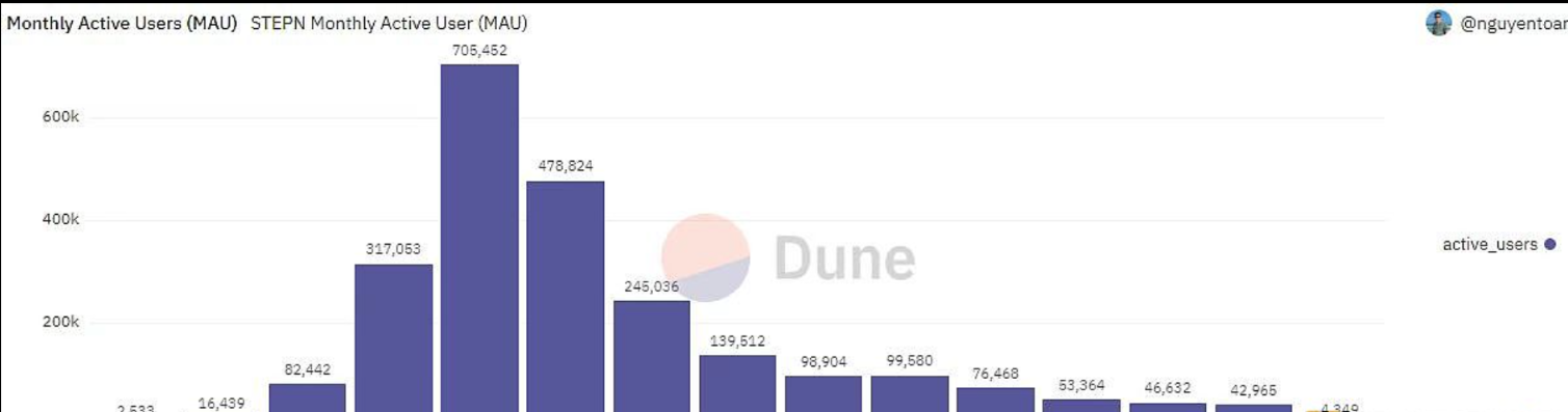 Dune Analytics数据显示,自2022年1月以来,市场对STEPN运动鞋的新需求持续下降,2月STEPN月活跃用户数已降至42,965个,较2022年5月创下的705,452峰值缩水近94%。 此外,STEPN旗下去中心化交易所(DEX)DOOAR的日均活跃钱包数量在Solana上DEX日活钱包总量占比也降至22%。