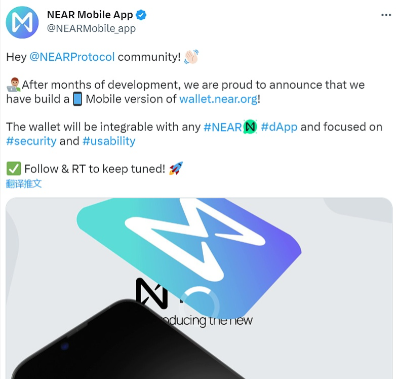 NEAR Mobile App宣布已完成移动端版本“NEAR数字钱包”的开发,将在接下来的几天内在测试网上推出第一个版本,该钱包将与所有NEAR DApp集成。