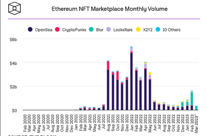 根据TheBlock的数据,在3月第一周所有基于以太坊的NFT交易中,有84%发生在Blur平台,超过了2月68%的高位,1月份为43%。这意味着在两个多月的时间里,Blur的市场份额几乎翻了一番,超过了竞争对手OpenSea。此外,2月份整个NFT市场与Blur一起上涨,达到了自5月以来的最高交易量。 TheBlock Research分析师Thomas Bialek表示,目前尚不清楚这种飙升是可持续的还是仅与Blur提供的激励措施有关。分析师表示,在不久的将来,这场激烈的NFT市场战争似乎可能会继续加剧,Blur需要证明其方法的持久性,而OpenSea需要推出有效的回击措施。