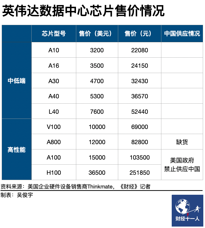 另有某大型服务器厂商人士对《财经十一人》表示,即使乐观估计,GPU储备规模最大的企业也不超过5万枚,且以英伟达中低端数据中心芯片(如英伟达A10)为主。这些GPU芯片分散在不同数据中心中,单个数据中心通常只配备了数千枚GPU芯片。