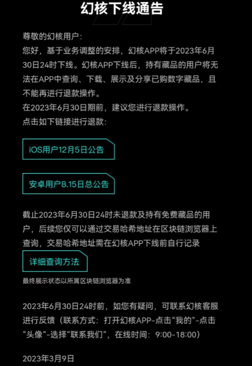 3月9日消息,腾讯数字藏品平台幻核今日在下线通告中表示:“基于业务调整的安排,幻核APP将于2023年6月30日24时下线。幻核APP下线后,持有藏品的用户将无法在APP中查询、下载、展示及分享已购数字藏品,且不能再进行退款操作。”幻核建议用户在2023年6月30日期前进行退款操作。