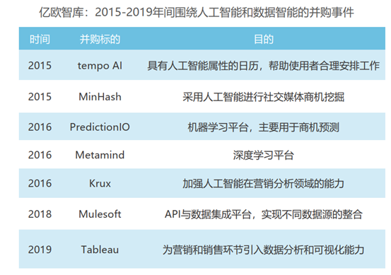 2015年左右,赛富时开始积极拥抱人工智能和大数据时代,当年收购了IOS平台第三方智能日历应用tempo AI 和机器学习公司MinHash,2016年又收购机器学习平台PredictionIO 和深度学习平台 Metamind,并正式推出人工智能产品Einstein。