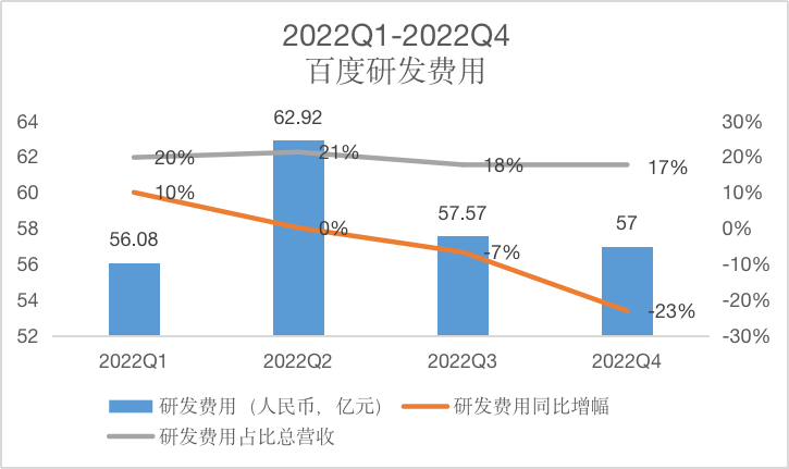 以百度为例,由于增收吃力本就在降本增效,随之减少的也有其研发费用。2022年第一季度到第四季度,百度研发费用从同比增长10%,到单季度同比下降23%,而研发费用在总营收中的占比也从20%下降至17%。