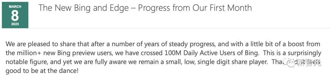 博文地址:https://blogs.bing.com/search/march_2023/The-New-Bing-and-Edge-%E2%80%93-Momentum-from-Our-First-Month/