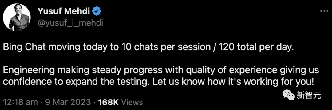 顺便,微软再再再次放宽了ChatGPT版必应聊天限制——每天120轮对话,每轮10句。