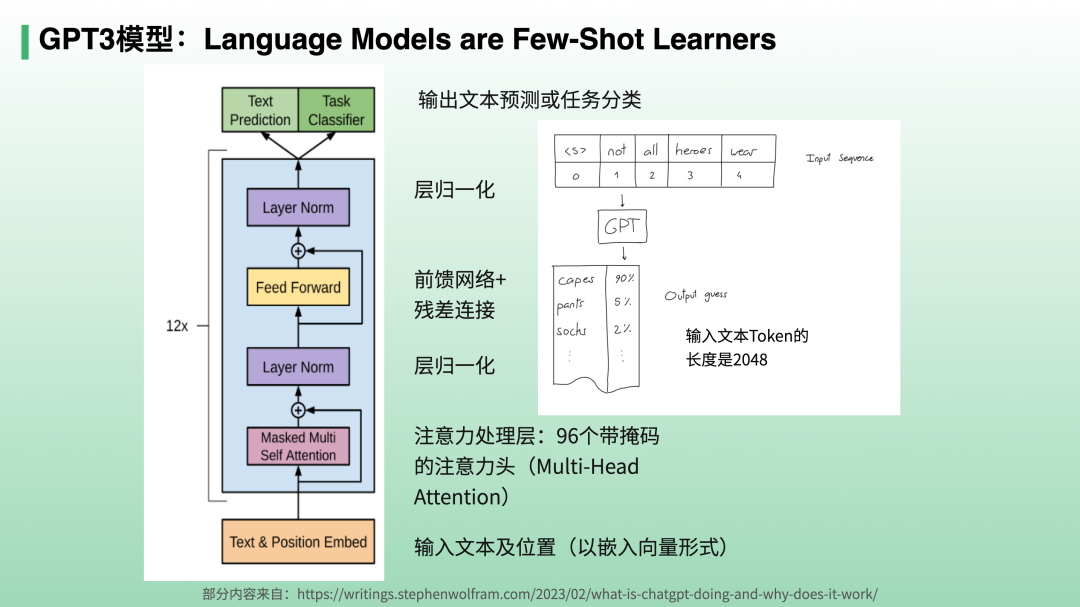 首先是算法。GPT-3采用的是Transformer的解码器,具有1750亿个参数和2048个Token(可简单理解为单词,下同)的训练文本长度。