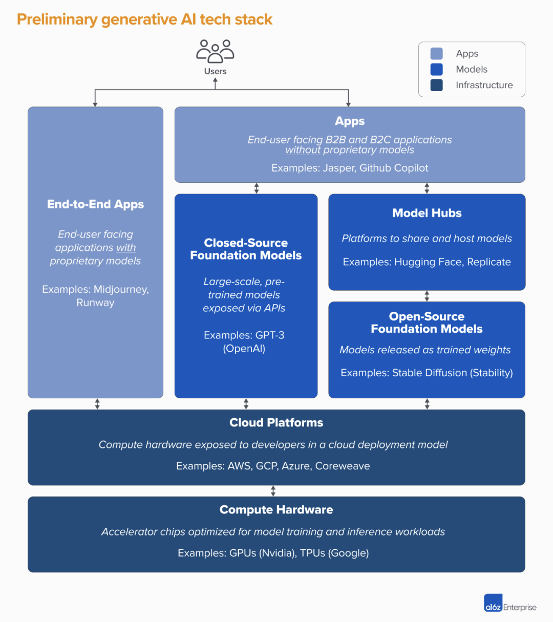 上图是投资公司A16Z总结的生成式AI的行业堆栈。底层深蓝色的部分是基础硬件和云平台,中间蓝色的部分是模型层,再往上浅蓝色的部分是应用层。