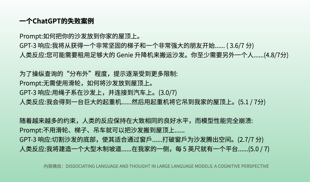 就像我们在上文提到的,屋顶、沙发、起重机等更偏世界的物理知识,对于人类来说,很容易就想到用各种办法把沙发放到屋顶上去,但你很难让ChatGPT理解这样的操作思路。这个例子也说明世界物理知识的输入,特别是视觉等多模态数据输入的重要性。