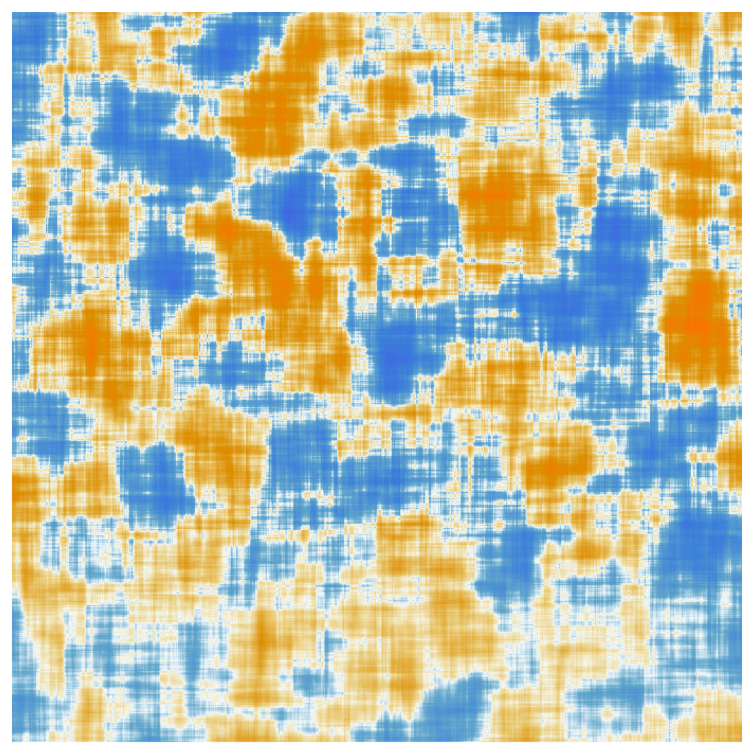 Stephen wolfram把GPT-2的某个前馈网络层存储的768*768维度的权重参数矩阵提取出来,压缩到64×64尺寸,就形成了如下一张神秘的图像,代表着GPT-2总结的神秘的人类语言编码规律及其他一些知识和能力的一部分。很好奇什么时候科学家可以逐步解密其中的部分内容,相信对于人类提升自我能力有好处。