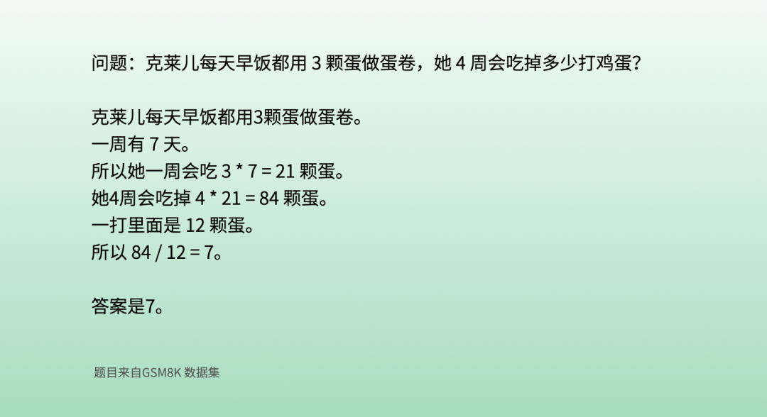 虽然这道题对于10岁的孩子来说很容易,但对语言模型来说却很难,主要是由于数学和语言混合在一起。这类问题只是开始,当前思维链的前沿科研工作已经转向更有难度的问题,例如高中、大学,甚至是国际数学奥林匹克问题。